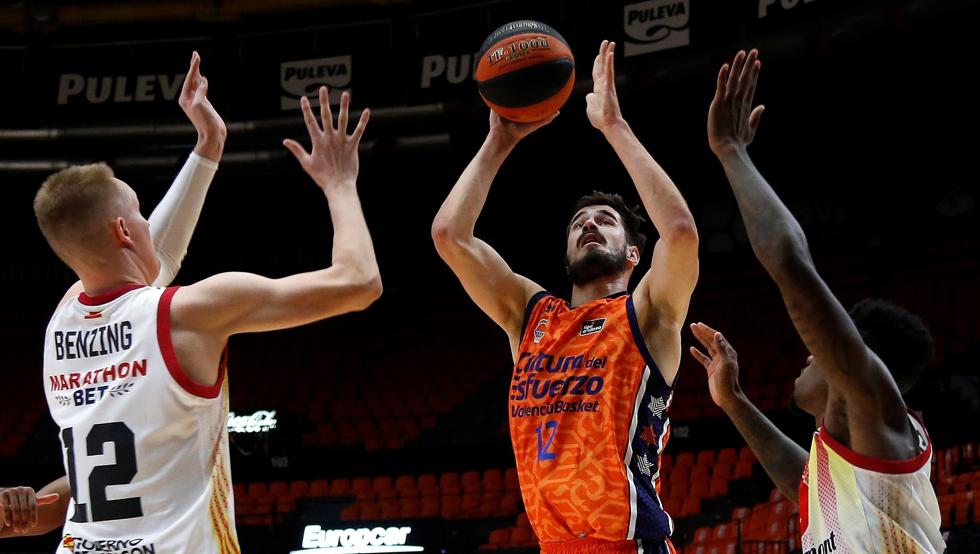 Incidencias: partido correspondiente a la séptima jornada de la Liga Endesa disputado en el pabellón municipal de la Fonteta a puerta cerrada por las medidas contra la expansión del coronavirus.