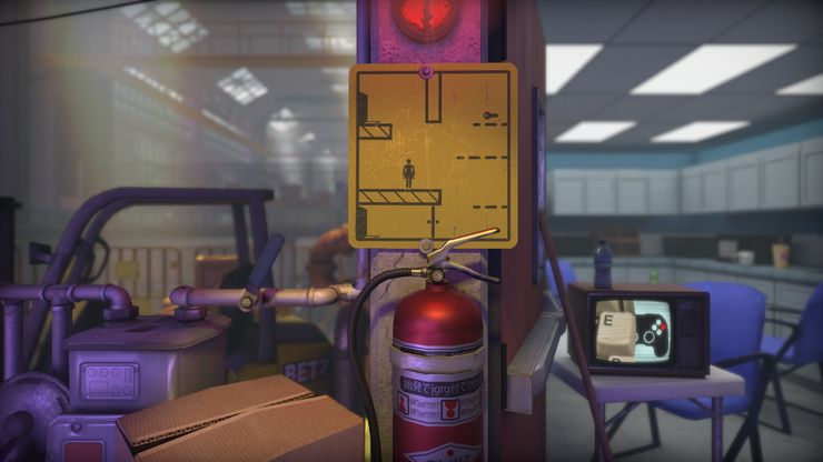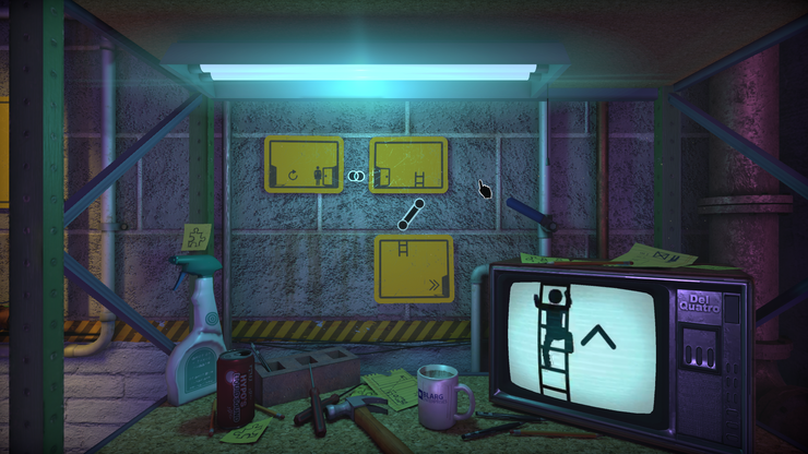Después de esto, al jugador se le presentan las llaves y las puertas cerradas como uno de los El peatónla mecánica del rompecabezas. Un televisor sentado en una silla plegable mostrará qué tecla o botón se usa para recoger objetos. Baja hasta la plataforma más grande, luego sube hasta la línea de puntos del medio. Sube a la línea de puntos con la llave y recógela. Baje hasta la parte inferior del panel, atraviese la puerta cerrada con la llave y salga por la última puerta.
