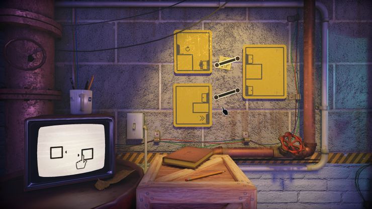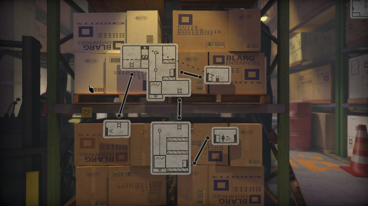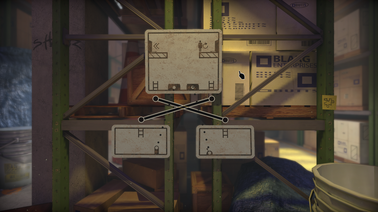 En el siguiente rompecabezas de Almacén, la habitación más grande no se puede mover. Esta mecánica aparecerá varias veces durante el transcurso de El peatón. Reorganice los dos paneles más pequeños para conectar las escaleras y las puertas para poder salir.