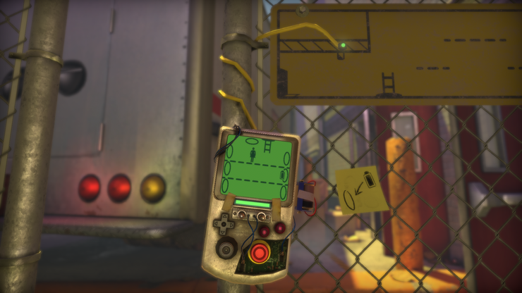 Un dispositivo de juego portátil se presenta en el siguiente rompecabezas de El peatón, así como una batería para alimentarlo. Salta a las líneas punteadas para agarrar la batería, luego baja la escalera para “ingresar” al dispositivo. Como indica la nota adhesiva, deje caer la batería sobre uno de los óvalos y luego vuelva a subir por la escalera. La barrera se quita cuando se coloca la batería, así que simplemente salga por la izquierda.