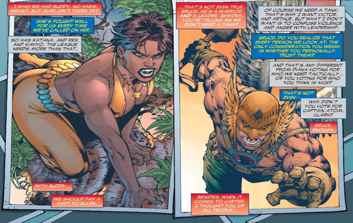Esto ocurrió durante una de sus reuniones para decidir quién se unirá a continuación a la Liga de la Justicia, mientras DC Trinity repasaba la posible lista de candidatos. Ciertos personajes como Powergirl fueron admitidos casi de inmediato, mientras que otros, como Vixen, se dijo que aún no estaban listos. Hawkman, sin embargo, fue vetado específicamente por Batman debido a la aversión personal de Bruce por el estilo del otro hombre.