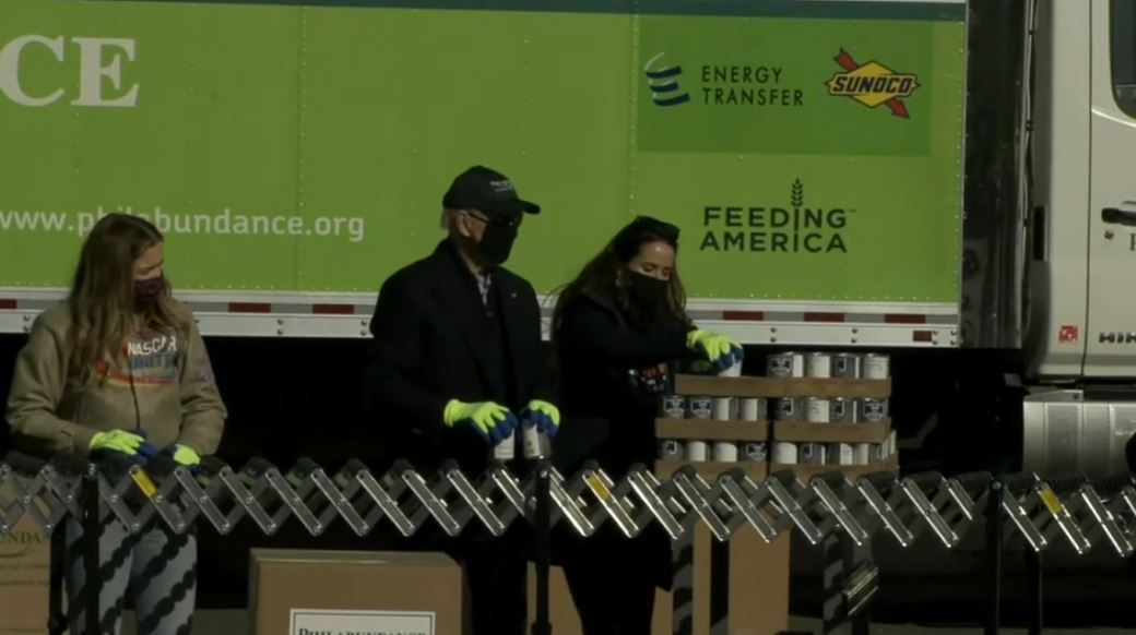 El presidente electo Joe Biden ayudó al equipo de Philabundance a confeccionar cajas de alimentos destinadas a familias desventajadas.