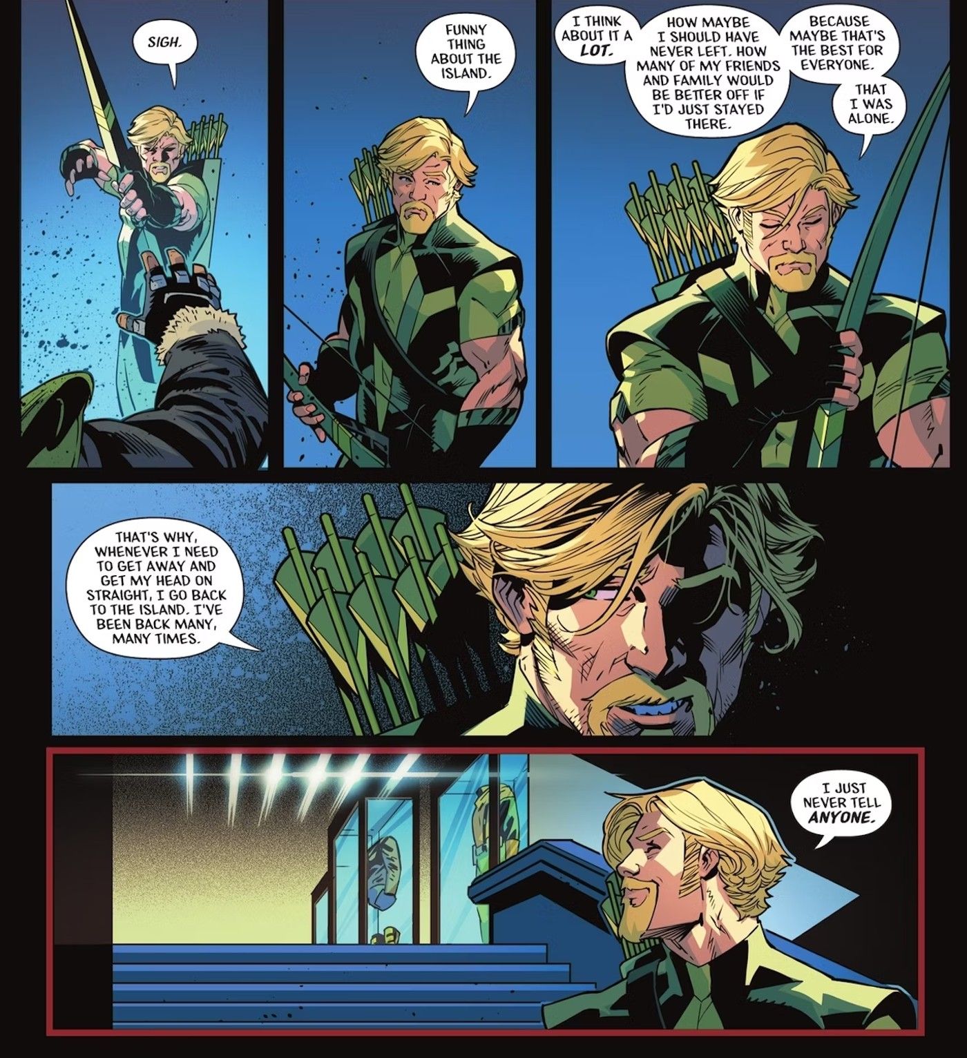 - Green Arrow ha regresado discretamente a la isla varias veces para aclarar su mente y ha llegado a ver lo bueno que hay en ella.