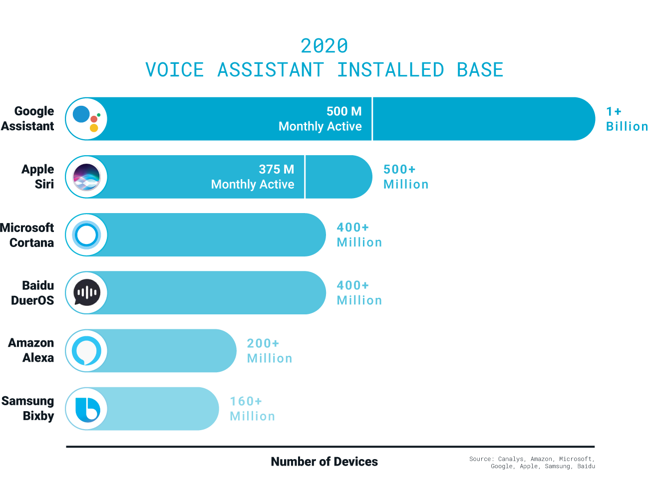 La adopción de cualquier nueva tecnología es clave. Un inhibidor clave de la tecnología es a menudo la distribución, pero este no ha sido el caso con la voz. Apple, Google y Baidu han reportado cientos de millones de dispositivos que usan voz, y Amazon tiene 200 millones de usuarios. Amazon tiene un trabajo un poco más difícil ya que no están en el mercado de teléfonos inteligentes, lo que permite una mayor distribución de asistentes de voz para Apple y Google.