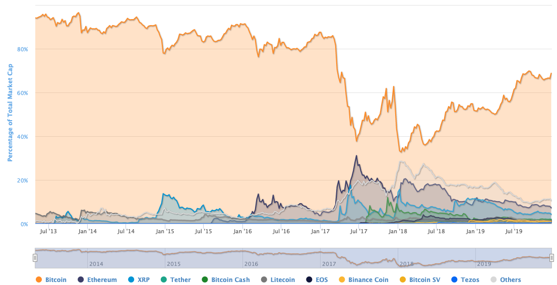 - 15 de diciembre de 2019, participación de bitcoin en la capitalización total del mercado de cifrado: ~ 66%