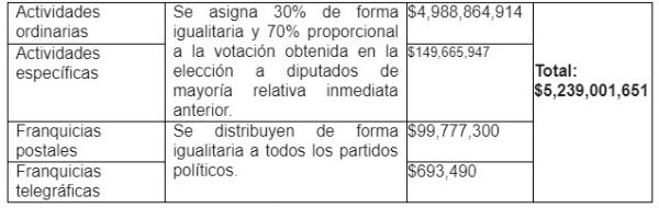 El financiamiento que se otorga a los partidos políticos está basado en la fórmula que establece la Constitución mexicana y se divide en cuatro rubros: