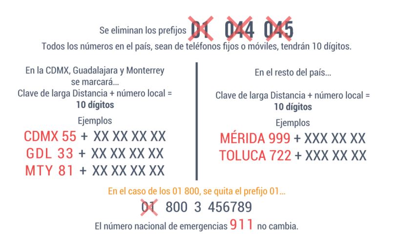 En un comunicado, explicó que en el caso de números móviles, se eliminan los prefijos 044 y 045, mientras que en los de larga distancia se elimina el 01.