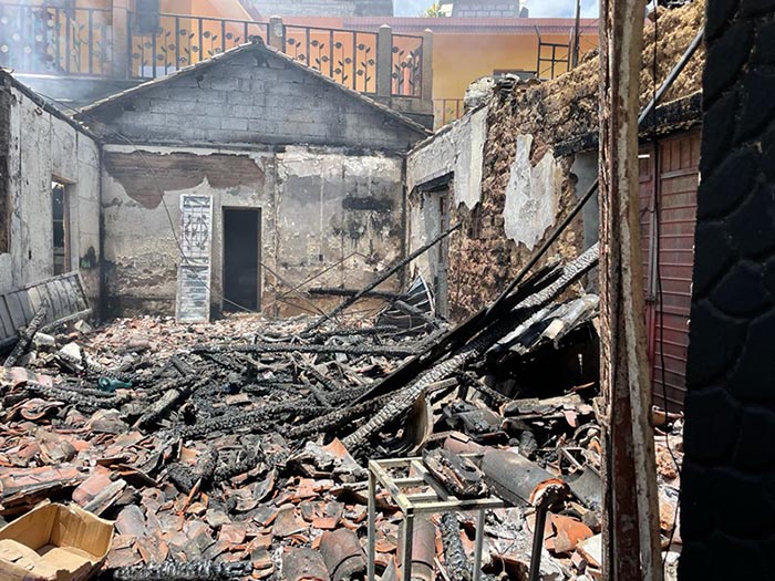 En otra esquina, una vivienda tiene la fachada quemada y en su interior todo incinerado. La vivienda destaca porque, a diferencia de las construcciones alrededor, tiene cámaras de seguridad y alambre con púas afiladas cubre la parte superior del techo.