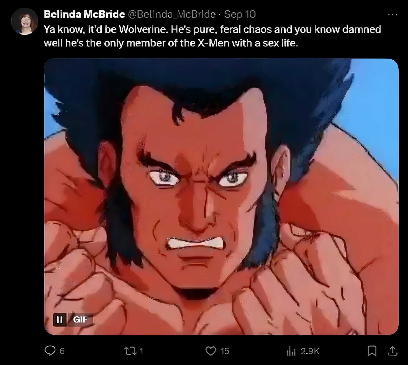 A medida que las respuestas se llenaron de montañas de fanart lascivas y elecciones apasionadas, aparecieron muchos nombres comunes a lo largo del hilo. Por extraño que parezca, algunos se acercaron primero a sus amores platónicos más besables por sus personalidades únicas. @Belinda_McBride presenta el argumento comúnmente aceptado de que lo que a Wolverine le falta en altura, lo compensa con un “caos salvaje”.