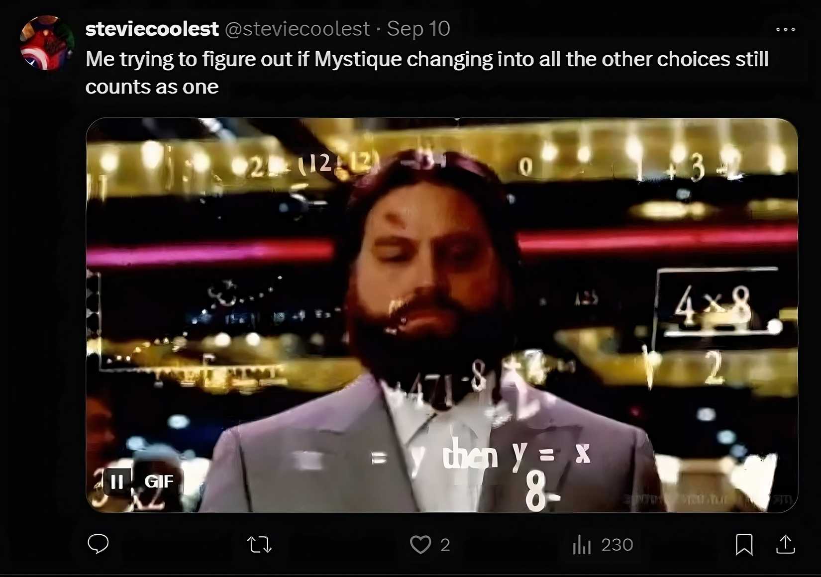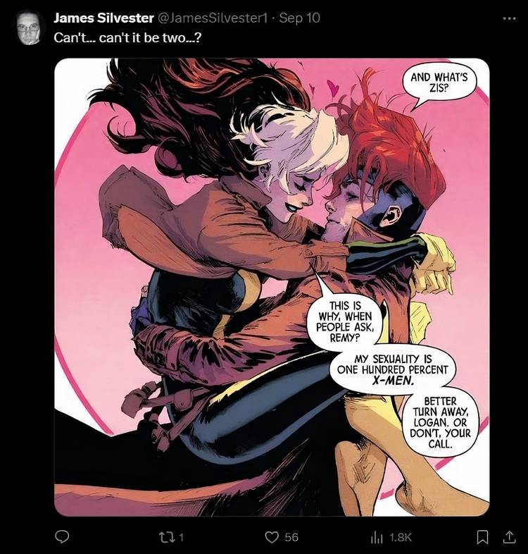 @steviecoolest hizo probablemente la pregunta más obvia pero poco frecuente: “¿No podría simplemente besarlos a todos besando a Mystique?” Dejando de lado el hecho de que la pregunta ignora la belleza azul natural de Mystique, lo siento Stevie, pero el Tweet dice solo UN beso, así que tienes que elegir uno. Sin embargo, muchos fanáticos tuvieron dificultades para elegir entre la poderosa pareja favorita de todos, Rogue y Gambit, aunque ambos lados estaban completamente preparados para que Rogue absorbiera su energía o recibiera una paliza de Rogue, dependiendo de su elección. Luego está @JamesSilvester1 que realmente quiere intentar besar a ambos.