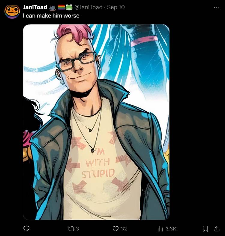 Nunca está bien avergonzar a alguien por su pareja de besos consensuada éticamente hipotética, pero algunos fanáticos realmente lo presionaron con sus elecciones. Si tan solo Bestia o Toad fueran las elecciones más controvertidas, pero en su lugar está Kid Omega. Kid Omega es un formidable héroe mutante que valientemente mantuvo la línea del frente durante la última invasión Sentinel de Krakoa, es justo @JaniToad. Sin embargo, es difícil olvidar su ego abrumador y sus crímenes de odio contra los humanos. Ah, y @ComicsNvinyl realmente está haciendo un gran comentario en este caso.
