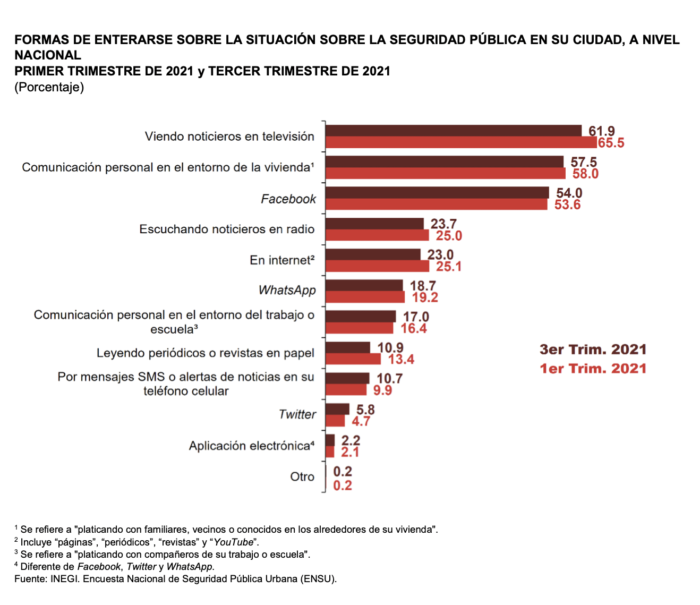 Y sobre dónde se enteran de los problemas de seguridad que hay en su ciudad, 61.9% de la población de 18 años y más dijo que consulta los “noticieros en televisión”; 57.5% mantiene “comunicación personal en el entorno de la vivienda” para dicho propósito; mientras que 54% se informa por medio de Facebook y 23.7% a través de “noticieros en radio”.