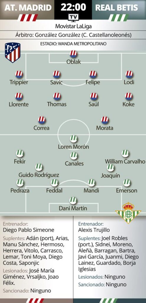 Simeone para este encuentro no podrá contar con Giménez después de que se torciese el tobillo en Vigo, su puesto seguramente lo ocupará Felipe, ni Joao Félix que sigue con sus problemas por el edema óseo que le obligo a dejar el partido contra el Mallorca. Las buenas noticias será que recuperará a Carrasco tras recuperarse de sus problemas y a Diego Costa tras cumplir sanción.