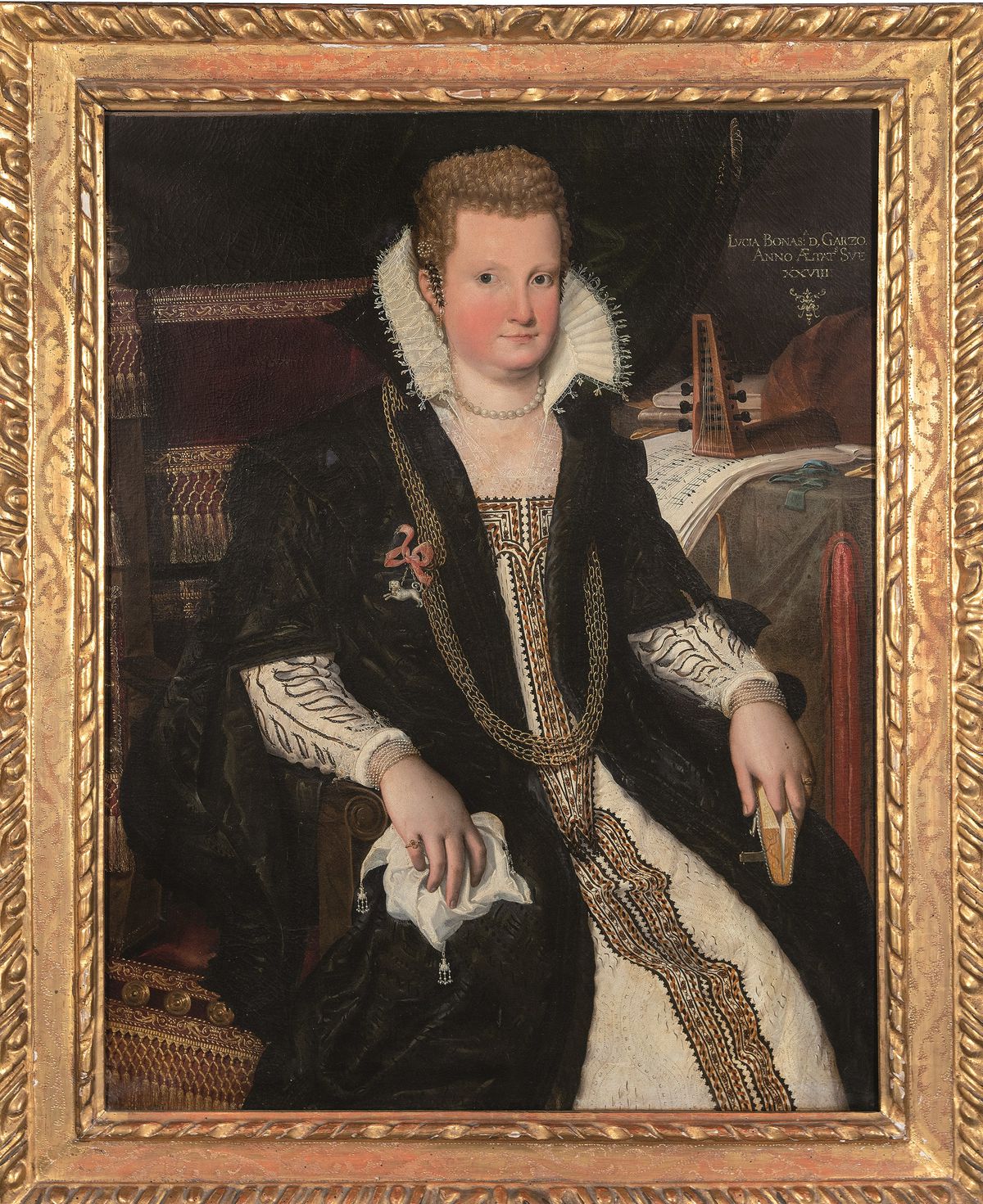 Mayores complicaciones tuvo Tanzi para identificar a la retratada. “La efigie fue reconocida como Donna Lucia Bonasi di Carzo”, escribe el experto, “una mirada mínimamente más atenta nos hace comprender de inmediato que la inscripción [que aparece en el cuadro] ha sido repasada en algún momento que ahora se nos escapa, probablemente cuando hubo un cambio en el marco, ligeramente más estrecho, y su ubicación ya no era la original. Al faltar la memoria familiar, el nombre no se leyó correctamente y se olvidó la identidad de la dama. Se trata de Lucia di Annibale Bonasoni”. Una mujer de la élite de Bolonia, dedicada a la música, por eso aparece retratada con una partitura y un instrumento.
