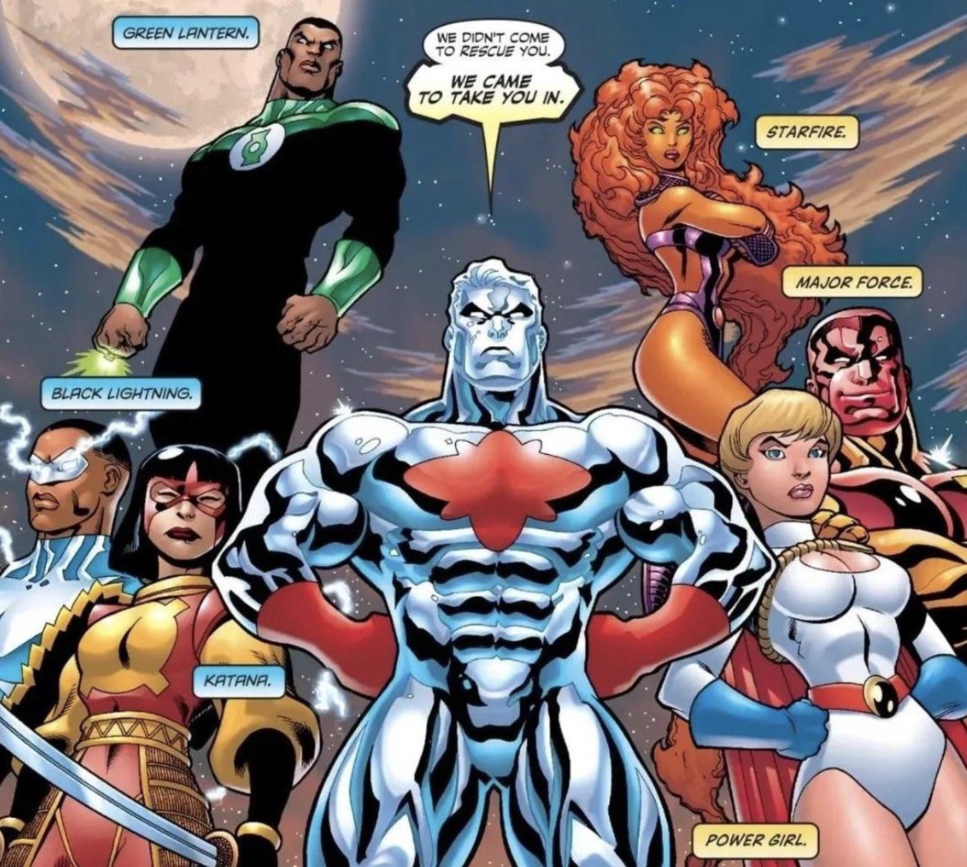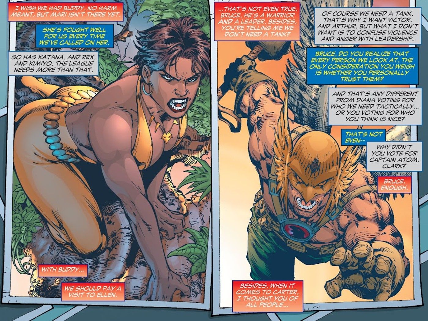 Esto llega a un punto crítico cuando Batman hace saber que no le gusta Hawkman, y cuando Superman intenta defenderlo, Batman señala que Superman no votó por el Capitán Átomo, a pesar de lo poderoso que sería en el equipo. Batman deja muy claro que la vacilación de Superman se debe al hecho de que no aprueba personalmente al poderoso héroe.