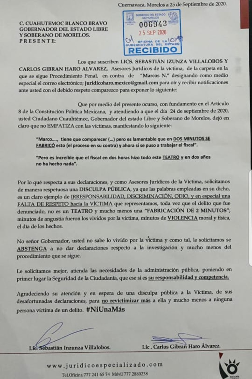“Por lo que respecta a sus declaraciones y como asesores de la víctima solicitamos de manera inmediata una disculpa pública, ya que las palabras empleadas en su dicho es un claro ejemplo de irresponsabilidad de discriminación, odio y en especial una falta de respeto a las víctima que representamos”.