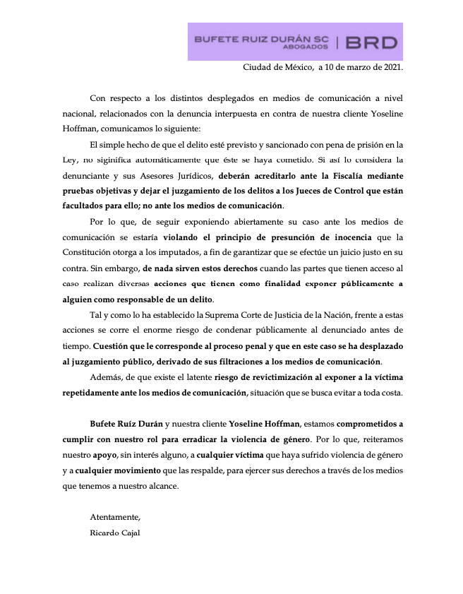 En el documento, firmado por Ricardo Cajal, indicaron que compartir información a los medios sin dejar que el proceso legal siga su cauce incrementa el riesgo de revictimización de la acusante al exponerla repetidamente de manera pública.