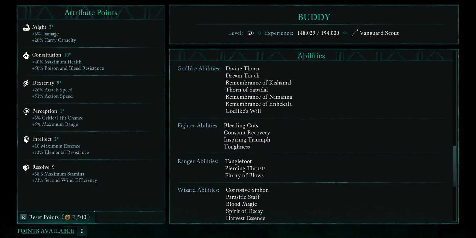 Tus atributos de vampiro núcleo son Constitución para la salud y la resolución de la resistencia. La salud/constitución es importante ya que la usará para compensar la falta de intelecto y esencia. Blood Magic es una habilidad de mago pasivo que te permite sacrificar la salud para continuar lanzando cuando te quedas sin esencia, y el personal parásito restaura la esencia con cada golpe, lo que hace que sea innecesario invertir mucho en intelecto. La resolución aumenta la resistencia y es necesario para alimentar los ataques de energía que harás con tus ejes y dagas con relativa frecuencia. También aumenta la segunda eficiencia del viento.