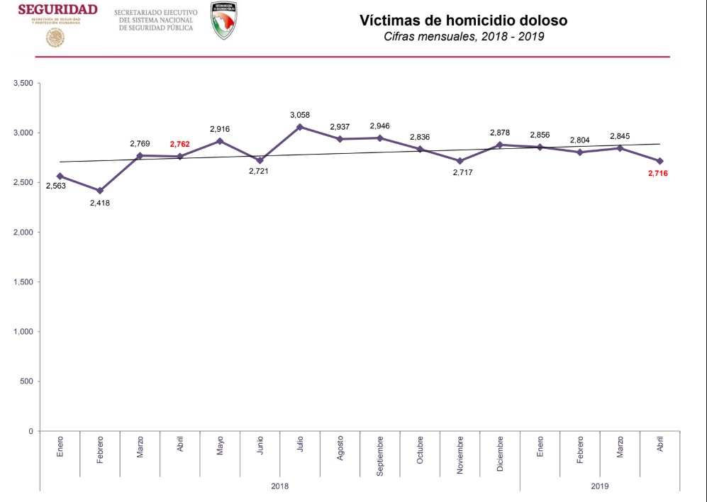 La cifra incluso es menor a los asesinatos cometidos en abril de 2018 cuando se registraron 2 mil 762.