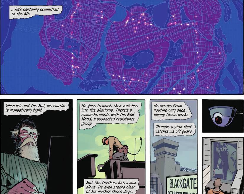 Ahora, en el número 2, el enfoque de Alfred se ha desplazado a rastrear la rutina de Bruce, tanto como Batman como en su identidad civil. Parte de esta meticulosa observación implica trazar un mapa de las casas seguras de Batman en la ciudad, identificando cada ubicación. Pero pronto, Alfred nota un patrón, un patrón con forma de murciélago, que emerge en el mapa.