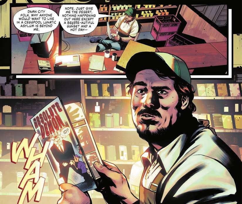 El lugar más cercano es una tienda de conveniencia, donde un dependiente pasa el tiempo leyendo un cómic. La serie se titula “Absolute Demon” y La portada muestra una versión mejorada de Etrigan con un traje que imita la pose de Bruce. Batman absoluto #1 cubrir.