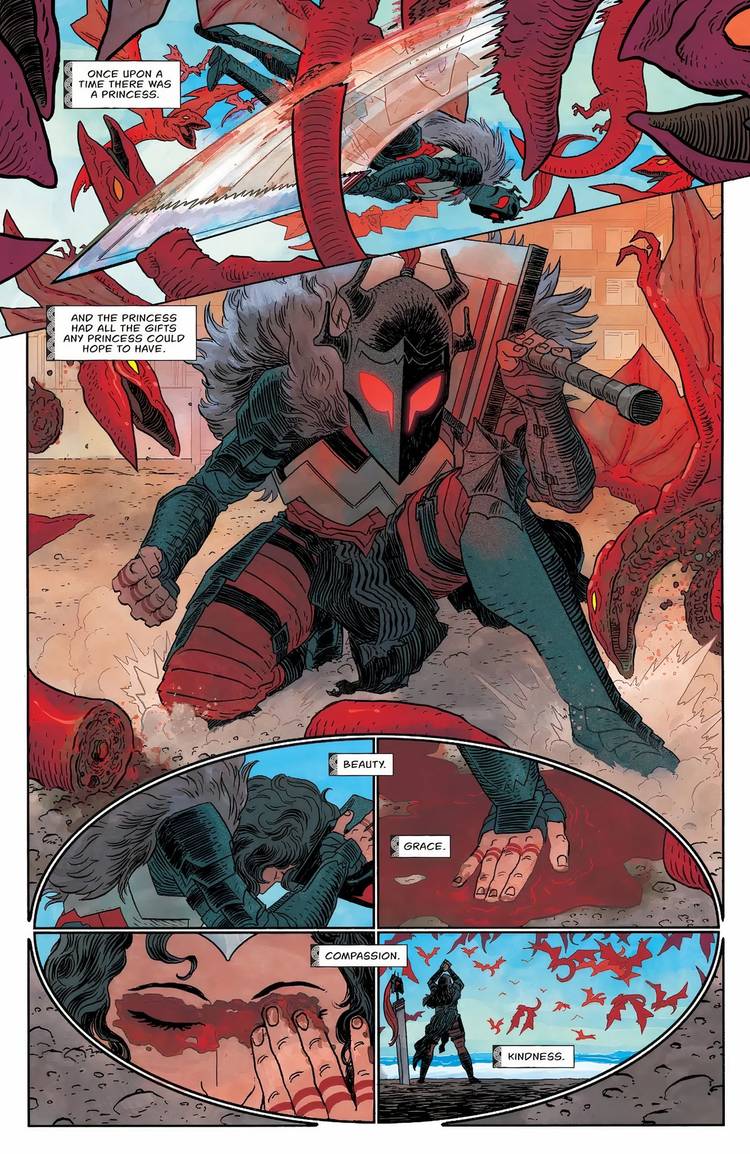 Hay mucho que elogiar Absoluta Mujer Maravilla historia, pero sería negligente no mencionar las sorprendentes imágenes de Sherman, especialmente durante las secuencias de acción. Para lo que los lectores aún necesitan aprender sobre el personaje de Wonder Woman en la actualidad, los lectores aprenden todo lo que necesitan saber sobre lo eficiente que es ella como luchadora. Las secuencias de lucha están impulsadas por los personajes sin que Diana tenga que decir una palabra. – a menos que sea un hechizo, por supuesto. Los lectores aprenden sobre la determinación, la resistencia y la compasión de Absolute Wonder Woman a través de su lucha.