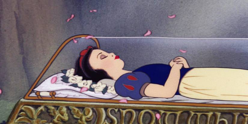 La manzana envenenada no mata a Blancanieves, sino que la envía a un sueño de muerte. Sin embargo, cuando la encuentran “tan hermosa incluso en la muerte” Los enanos no pueden enterrar a Blancanieves (El plan de la Reina era que los enanos entierrenla viva). En cambio, hacen un ataúd de vidrio y oro para ella, manteniéndose “vigilia eterna“A su lado. Debido a que dejan Blancanieves en el ataúd de vidrio en el bosque, el Príncipe puede encontrarla, y el resto es historia.