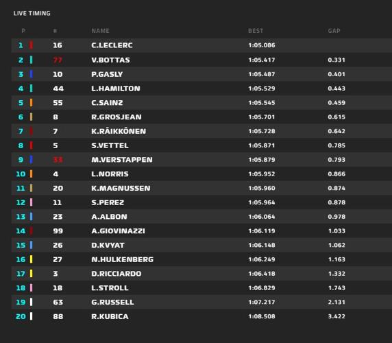 Mientras, Hamilton, que había partido varios alerones por la mañana, también sufría para hacer una vuelta limpia, pero evitaba cualquier problema mayor. No arriesgaba en su vuelta, dejando el liderato de la sesión para Leclerc, con 0”331 de ventaja sobre Bottas, 4 décimas sobre Gasly y 0”443 sobre el inglés, y se centraba en trabajar en un ritmo de carrera muy constante. tantas banderas rojas impidió que se pudiera hacer una comparativa real de tiempos, pero parece que Ferrari, sobre todo en ritmo de carrera, podría estar muy cerca de Mercedes, por lo que la batalla debería ser mucho más emocionante que en Paul Ricard.
