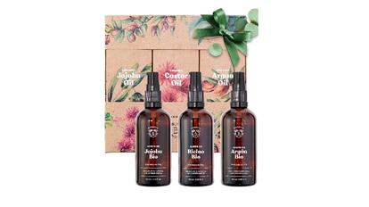 En el pack podemos encontrar una selección de tres aceites vegetales adecuados para dar brillo al cabello apagado o limitar los efectos de las agresiones externas en la piel. El aceite de ricino orgánico, por ejemplo, estimula el crecimiento del pelo, asegura unas pestañas más densas y endurece las uñas quebradizas. El aceite de argán, por su parte, es adecuado para devolver la firmeza y elasticidad a la piel. Y, por último, el aceite de jojoba ayuda a reducir las imperfecciones cutáneas y aporta luminosidad al cabello apagado. Además, regula el sebo y no deja la piel grasa.