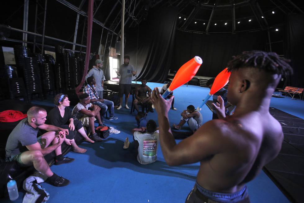 No han dado las diez de la mañana y una chica ya está calentando para subirse al trapecio. Un joven, delgado, fibrado y de amplia sonrisa, pedalea una cuidada bicicleta roja hasta que coge velocidad y se sube sobre ella para hacer malabares. “Empecé a ensayar en enero”, cuenta Musa, de 17 años. Lleva en el circo más de una década: “Empecé cuando era joven”, relata. Se inscribió porque su madre le animó a formar parte de la troupe: “¿Conoces Zip Zap?”, le preguntó. “Allí hay todo tipo de niños. Algunos como tú que son portadores del VIH”, agregó. Musa nació con VIH en Khayelitsa, la favela más grande de Ciudad del Cabo. “El circo me trajo a un lugar seguro, me aportó amigos, amor y confianza”, cuenta el joven para acto seguido encaramarse en su bici roja y continuar con su entrenamiento.