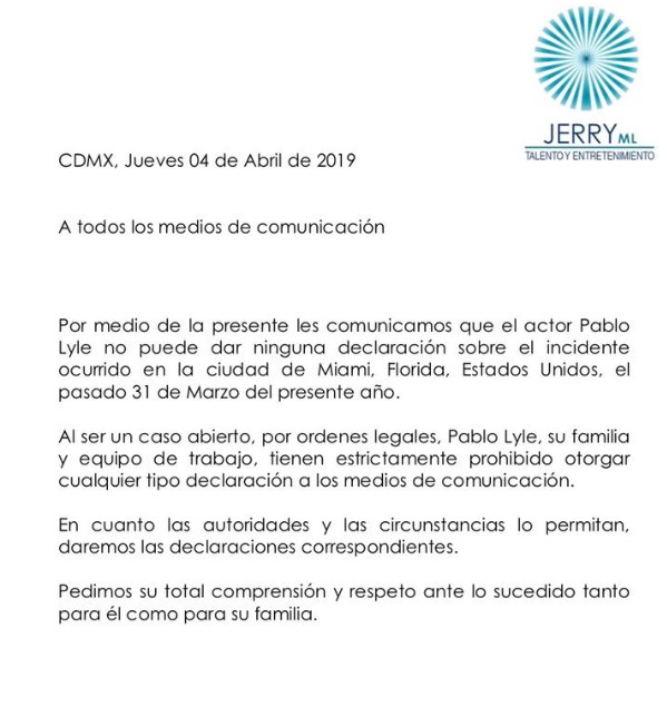 La emisora local en Florida de la cadena estadounidense NBC confirmó, citando a la Policía de Miami, que las autoridades estatales investigan a Lyle por homicidio luego de que el jueves 4 de abril se difundiera el video de una cámara de seguridad que muestra el momento en que el actor mexicano bajó de su camioneta, corrió hacia el hombre de 63 años y lo golpeó, para luego regresar a su vehículo dejando a la víctima tirada en la calle.