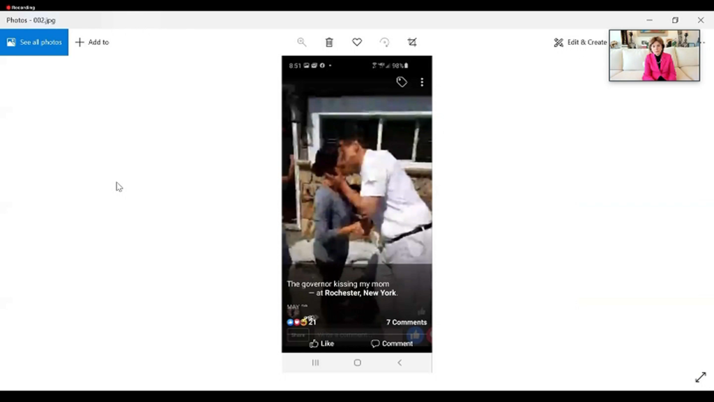 - Sherry Vill, una madre casada con tres hijos, celebró una conferencia de prensa junto a su abogada Gloria Allred alegando que el gobernador la agredió sexualmente cuando besó “a la fuerza” sus dos mejillas después de entrar a su casa. Durante el discurso, Allred presentó una serie de fotografías del encuentro del 28 de mayo de 2017 que, según ella, demuestra que Cuomo tocó a Vill de manera inapropiada.