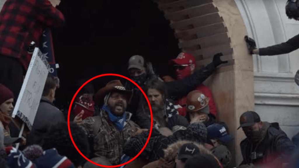 Según una denuncia penal, Coffee vestía un sombrero marrón, ropa de camuflaje y un pañuelo azul, y supuestamente empuñaba una muleta mientras intentaba abrirse camino hacia el Capitolio de los Estados Unidos el 6 de enero.