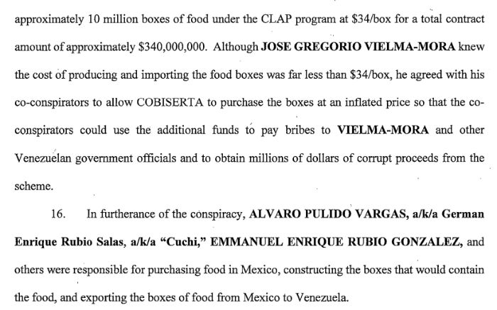 El documento de la corte federal detalla que desde 2016 Álvaro Pulido y su hijo comenzaron a utilizar la empresa Group Grand Limited para comprar alimentos en México a precios bajos, armar cajas de despensas y exportarlas a Venezuela con precios inflados.