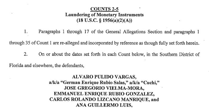 Se acusa que el menos entre 2015 y 2020 conspiraron con otros para lavar el dinero de cuentas bancarias en Antigua, los Emiratos Árabes Unidos y otros lugares a través de cuentas de Estados Unidos.