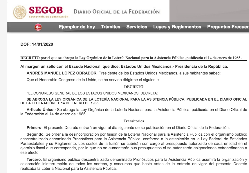 La Ley Orgánica de la Lotería Nacional para la Asistencia Pública estaba vigente desde el 14 de enero de 1985, informó la Secretaría de Hacienda y Crédito Público (SHCP), en un decreto “por el que se abroga” dicha legislación, publicado en el Diario Oficial de la Federación (DOF).