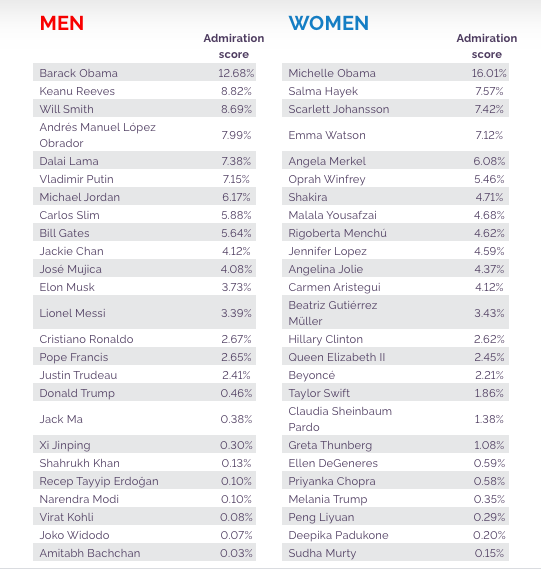 En ambas listan destacan como los únicos mexicanos el presidente Andrés Manuel López Obrador (7.99%); la actriz Salma Hayek (7.57%); el empresario Carlos Slim (5.88%); la periodista Carmen Aristegui (4.12%); la escritora Beatriz Gutiérrez Müller (3.43%); y la jefa de Gobierno, Claudia Sheinbaum (1.38%).
