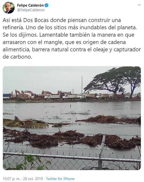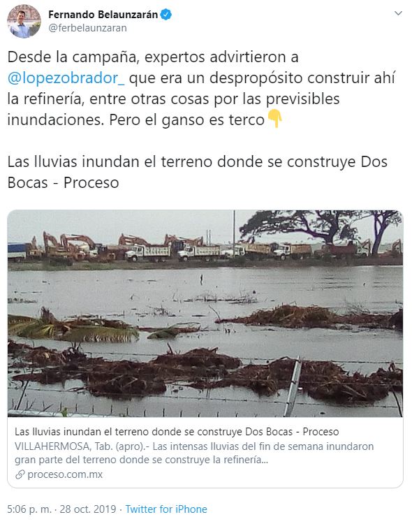 De acuerdo con Proceso, las intensas lluvias del fin de semana inundaron gran parte del terreno donde se construye la refinería de Petróleos Mexicanos (Pemex) en el puerto de Dos Bocas, del municipio de Paraíso.
