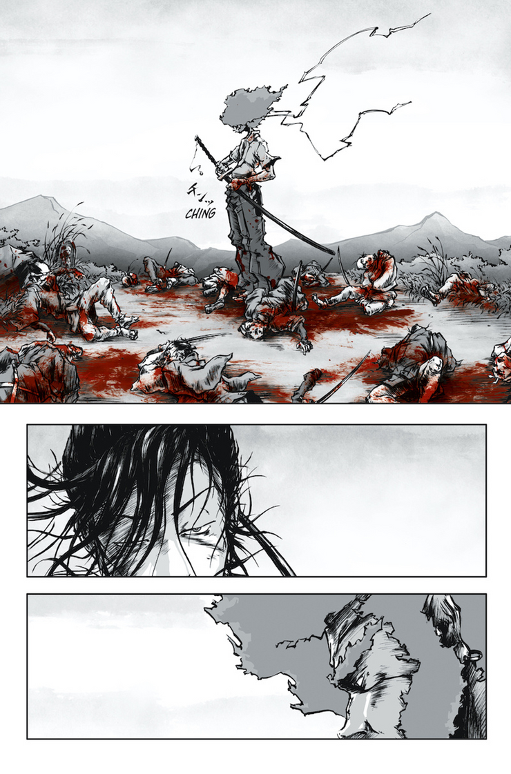 Publicado inicialmente entre 1998 y 2002, samurái afro cuenta la historia de Afuro, un samurái itinerante serio que viaja por la tierra en busca del maestro de la espada “Número 1”. Cuando Afuro era un niño, su padre era el Número 1, pero fue asesinado ante sus ojos por Justice, el maestro de la espada Número 2 en ese momento. Jurando devolverle el favor algún día y vengar a su padre, Afuro dedica su vida a lograr ese objetivo. En el transcurso de su búsqueda para encontrar y luchar contra Justice, Afuro no solo se convierte en un espadachín letal, sino también en un héroe accidental para cientos de personas que conoce en el camino.
