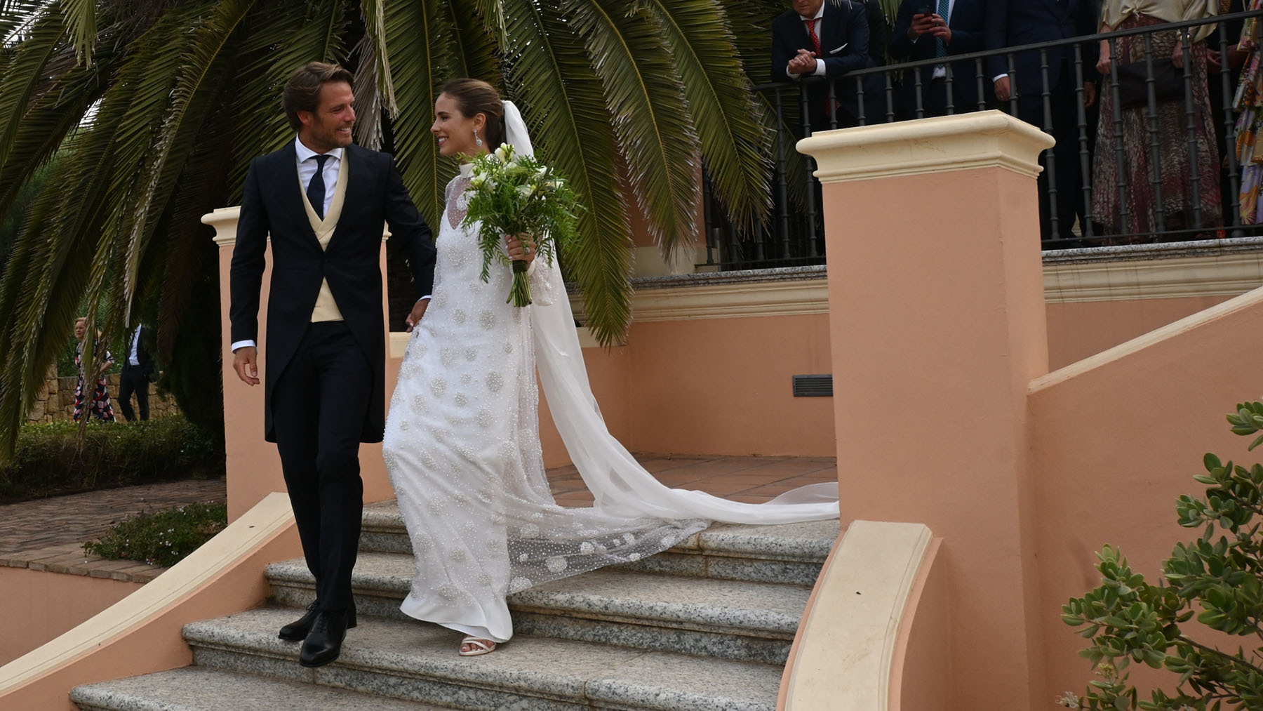 Para darse el ‘sí, quiero’ con el hombre que se ha convertido en el amor de su vida, la novia ha escogido un atemporal slip dress en color blanco satinado y ajustado a la silueta con la espalda al aire, que ha combinado con un sobrevestido amplio con cola, lleno de detalles bordados en pedrería con cuello cerrado y manga larga. De su coleta ondulada ha nacido un larguísimo velo, que ha dejado entrever unos pendientes largos plateados con brillantes en forma de lágrima que colgaban de sus orejas. Una vez finalizada la ceremonia, la novia se ha trasladado junto a su ya marido hasta el banquete en un precioso y elegante jeep azul descapotable. Para esta celebración posterior, Casilda se ha cambiado de estilismo, luciendo unos cómodos y originales pantalones anchos combinados con un top en tonos blancos. Por su parte, el novio ha lucido chaqué azul marino con corbata a juego, combinado con un chaleco color crema y camisa blanca.