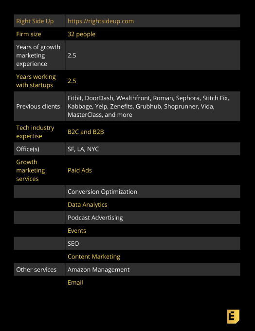 Lado derecho hacia arriba no es Su agencia de marketing de crecimiento típico. Como ex empresario y comercializador de crecimiento interno para startups como Eventbrite, el fundador Tyler Elliston dice que creó RSU como una forma de ayudarse a sí mismo. RSU contrata a un colectivo de expertos en marketing de crecimiento y los asocia con varias compañías, pero a diferencia de una agencia tradicional, RSU alienta activamente a los equipos de crecimiento a contratar a sus mejores talentos.