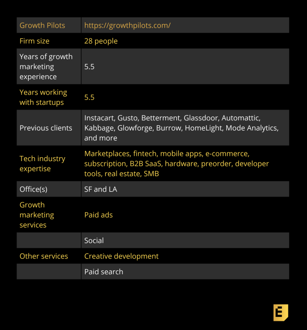 Pilotos de crecimiento es uno de las agencias de marketing de rendimiento más exclusivas en San Francisco, pero saben cómo ayudar a las startups de alto crecimiento a destacar en marketing pagado. El CEO y fundador Soso Sazesh acredita sus experiencias personales como empresario, junto con la profunda comprensión de su equipo de las necesidades y los desafíos de la empresa de alto crecimiento en cuanto a lo que distingue a Growth Pilots. Ya sea que usted sea el fundador de un inicio de etapa de serie o serie D, obtenga más información sobre el enfoque de crecimiento de los pilotos y las asociaciones.