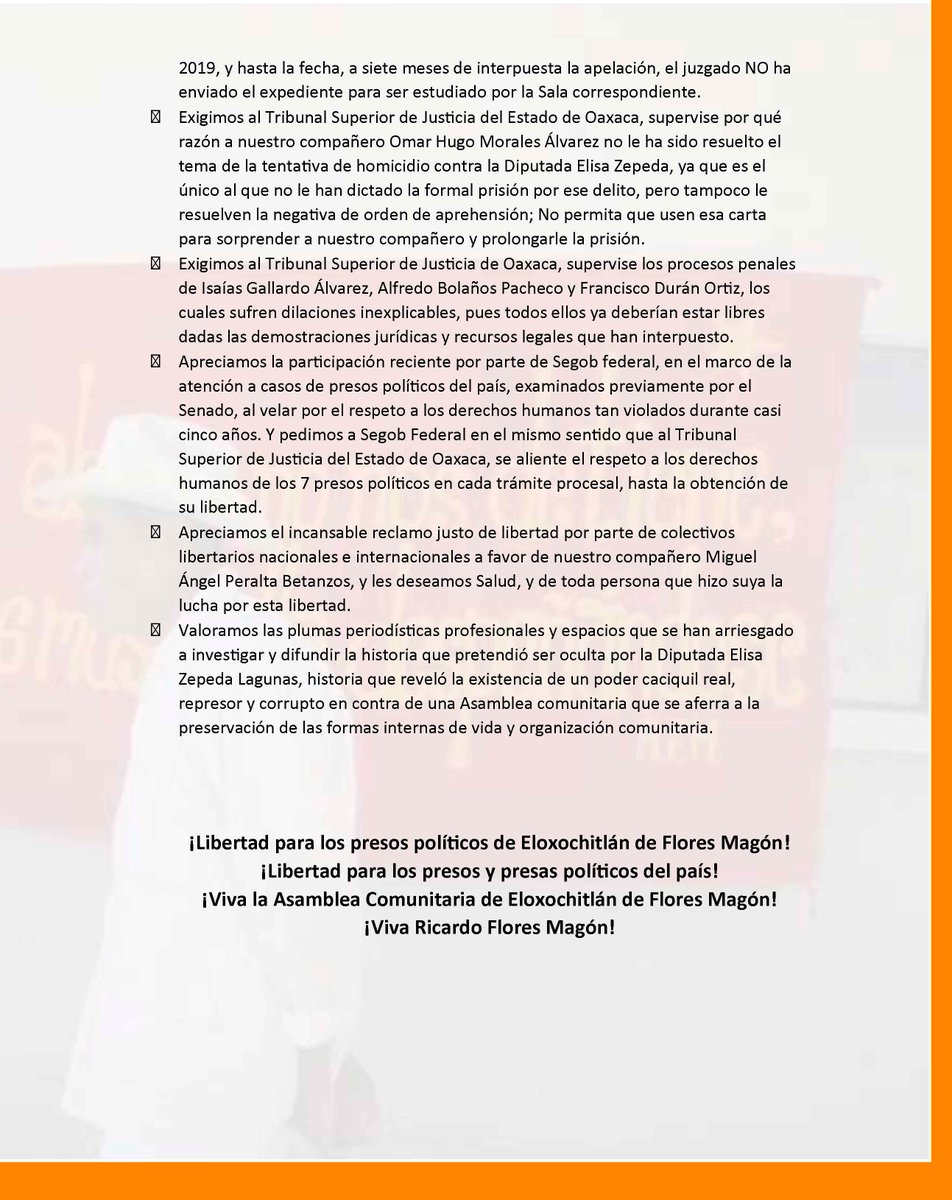 En contraste y en el sentido contrario, la Asamblea Comunitaria de Eloxochitlán manifestó su alegría por la liberación de Miguel Ángel Peralta tras un proceso penal “lleno de irregularidades”.