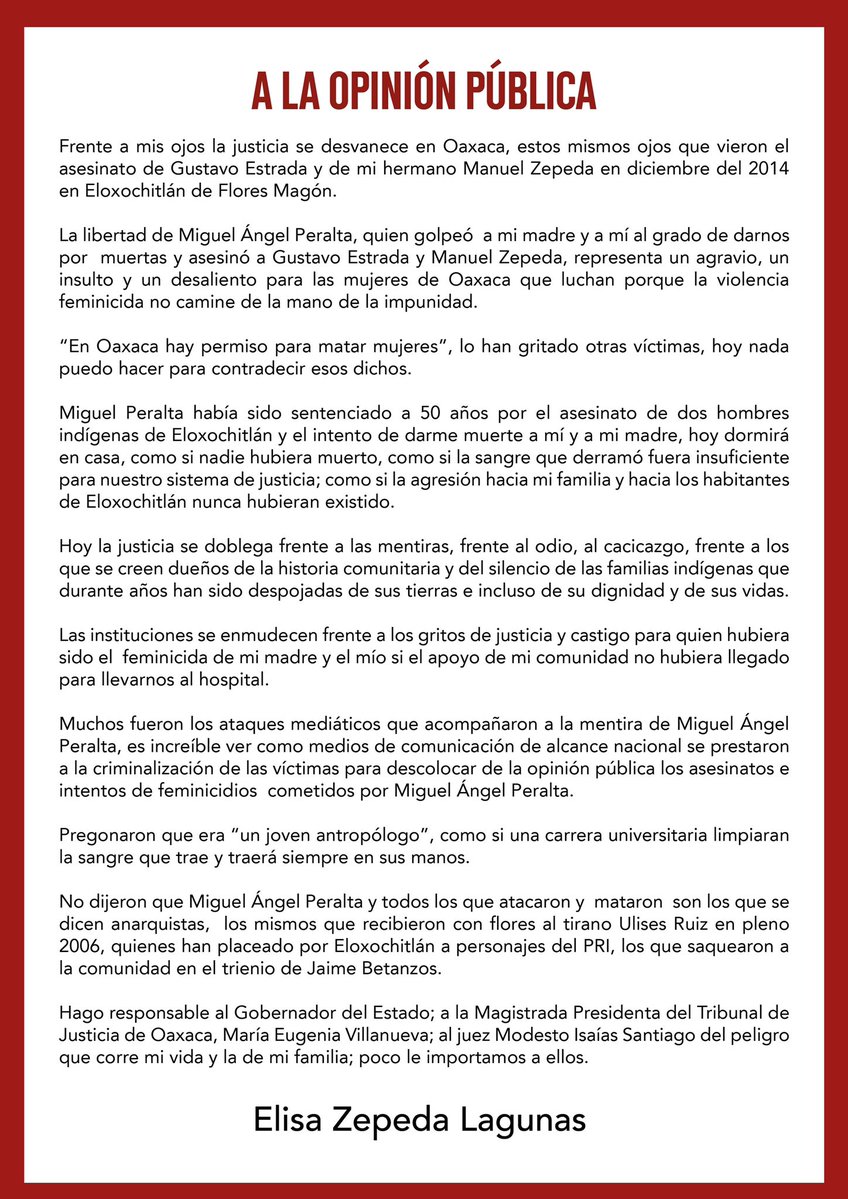 Tras la liberación de Miguel Ángel Peralta, acusado de homicidio por parte de la diputada de Morena, Elisa Zepeda, ésta aseguró que “frente a mis ojos la justicia se desvanece” y “representa un agravio, un insulto y un desaliento para las mujeres de Oaxaca”, luego del asesinato de Gustavo Estrada y de su hermano Manuel Zepeda en diciembre del 2014 así como un presunto intento de asesinato contra ella y su madre.
