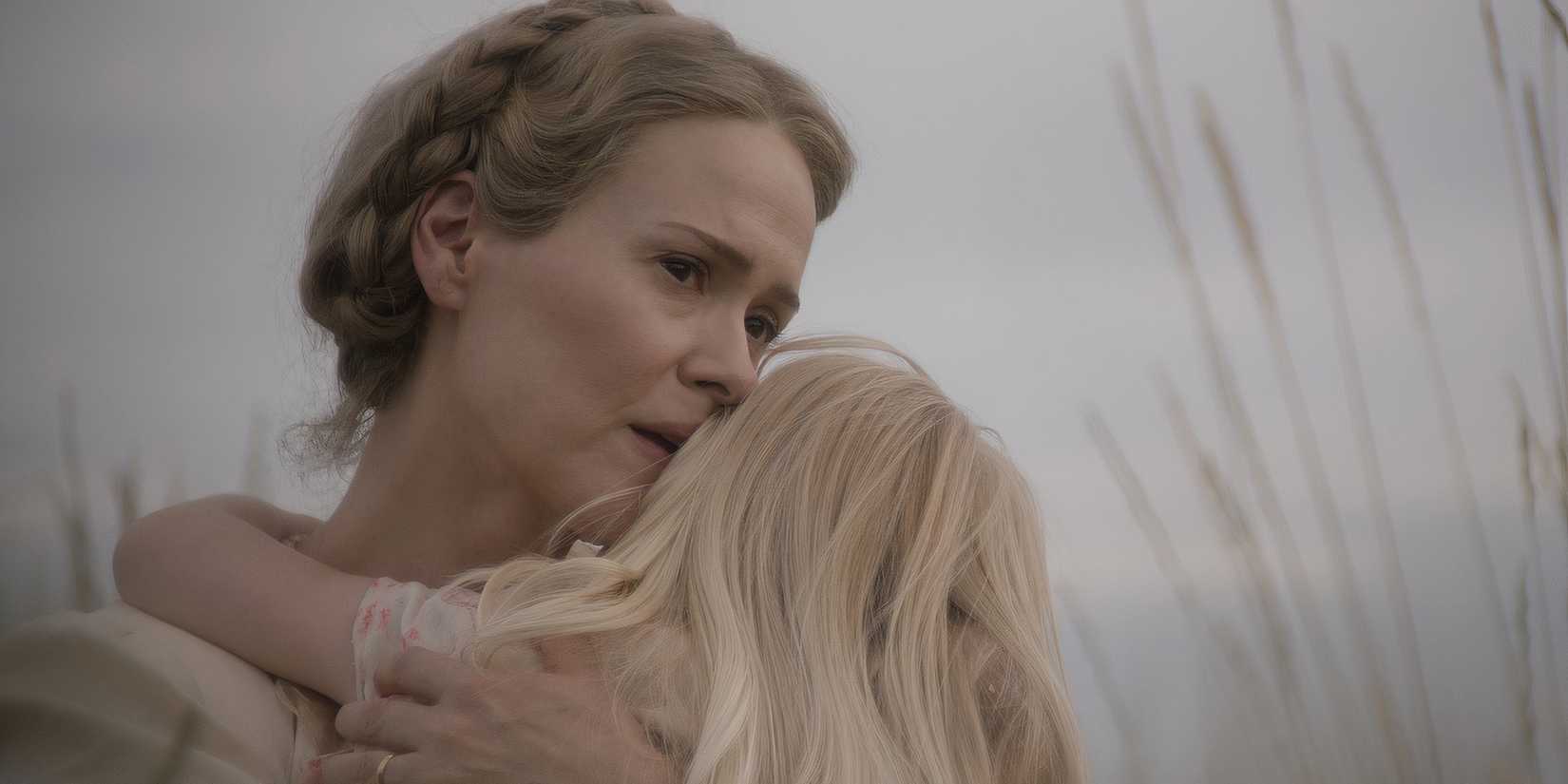 A lo largo de Aguanta la respiración, Margaret de Paulson y sus dos hijas, Rose (Miller) y Ollie (Robbins)deben defenderse de una serie de tormentas de polvo que parecen tener poderes misteriosos y siniestros. Cubren cada grieta y hendidura de su casa para mantener alejado al mítico Hombre Gris, que es un personaje de una historia espeluznante que aparentemente cobra vida. El pasaje inicial de la historia dice: “El Hombre Gris… se filtra a través de las grietas… Lo inhalarás… harás cosas terribles..” Al final de Aguanta la respiraciónMargaret hace todo lo posible para proteger a Rose y Ollie, pero no puede protegerlos de la verdadera amenaza: ella misma.