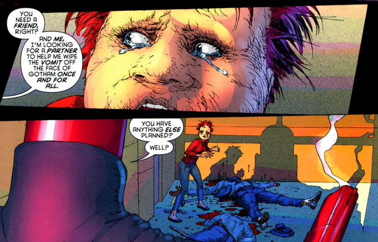 Si bien es bueno que Jason haya intentado dar un paso atrás en sus intentos de matar, tiene un cabo suelto que realmente necesita abordar. En batman y petirrojo #3 por Grant Morrison y Frank Quitely, Jason se encuentra con Sasha, una joven que ha sido mutilada, junto con su padre, por el profesor Pyg. Todd le ofrece la oportunidad de canalizar la rabia que siente al aceptarla como su nueva pareja. Con la nueva identidad de Scarlet, se convierte en una parte integral de la nueva campaña de Red Hood para ser el protector número uno de Gotham después de que se presume que Batman está muerto. Jason entrena a Sasha para luchar y le da un par de cuchillas, convirtiéndola en una asesina tan despiadada como él. Con la ayuda de Scarlet, Red Hood es capaz de acabar con más villanos y figuras de la mafia de los que nunca había hecho por su cuenta.
