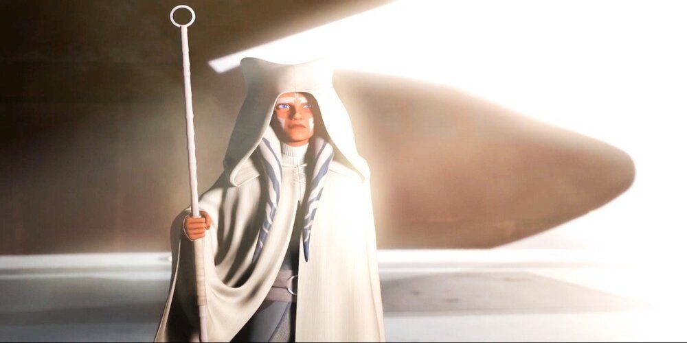 Los comentarios de Dawson también incluyen la idea de que Ahsoka todavía tiene algo de desarrollo por delante, sin embargo, antes de convertirse realmente en la Guerra de las Galaxias equivalente a Gandalf el Blanco. Esto es algo que se refleja en los ligeros retcons realizados entre Ahsoka y rebeldes‘ finalizando. En rebeldesAhsoka se ve con su capa blanca y bastón, algo AhsokaEl marketing de ha cambiado con el personaje en lugar de usar una capa gris. Esto refleja los comentarios de Dawson y podría probar que Ahsoka se ha cambiado un poco en el sentido de que cuenta la historia de cómo se convierte en lo que se burló al final de rebeldes.