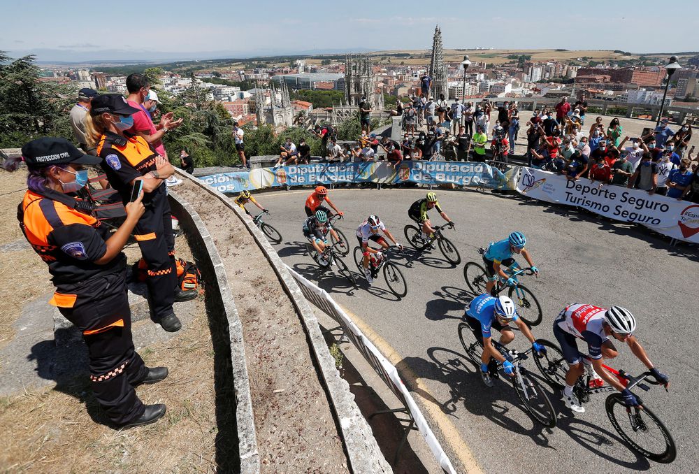 El pelotón durante la primera etapa de la Vuelta a Burgos que empezó este martes.Santi Otero / EFEFelix Großschartner, un chaval austriaco de 26 años, luce al ganar un espectacular bigote pelirrojo sobre su boca abierta en gran sonrisa, y todo desaparece cuando sube al podio a la sombra de las ruinas del castillo de Burgos oculto bajo un tapabocas cuyo color, morado, verde, blanco, cambia según va cambiando el color de los maillots que se le imponen en el escenario, tan austero, tan castellano, como el páramo que bajo el sol de mediodía ha atravesado, azotado por el viento y las caídas, el primer pelotón de gran ciclismo que por primera vez desde el 15 de marzo pasado se ha puesto en marcha.Todo ha comenzado en la Vuelta a Burgos, la única competición que mantiene las fechas previstas (hasta el sábado 1) y a la que, por ello, le ha tocado inaugurar el regreso, ensayar la eficacia de las medidas adoptadas por la Unión Ciclista Internacional (UCI) para que la competición no se convierta en foco de contagios, acoger la impaciencia y la ansiedad de tantos ciclistas, jóvenes impacientes, que llevan semanas deseando que se les dispare la adrenalina, que todos los vatios derrochados sobre los rodillos o en entrenamientos interminables en montañas solitarias se transformen en fuego en la competición.Para ser admitidos en la carrera, todos los ciclistas han debido presentar un PCR negativo en las 72 horas anteriores. Burgos ha salido con 152 corredores, dos menos de los inscritos, por la baja de dos ciclistas del Israel Start-UP Nation, Itamar Einhorn y Alex Dowsett, quienes, pese a PCR negativos, no han salido ya que, antes de viajar a Burgos, estuvieron en contacto con su compañero Omer Goldstein, quien se quedó en Girona tras dar positivo.Bajo el toldo del podio burgalés, una fuentecita de la que brota, al pisar con el pie un pedal, no agua sino gel hidroalcohólico con el que se lavan las manos los pocos que suben, las azafatas, que no dan besos sino golpecitos con el codo, las autoridades, que entregan con delicadeza botellas y trofeos, y los ciclistas enmascarados que, como dice Großschartner en inglés, a metro y medio del periodista que empuja su micrófono con una pértiga de dos metros, se sienten felices por volver a ser lo que son y más felices aún por haberlo hecho bien en su regreso.En el ciclismo de la nueva normalidad, la de la convivencia inevitable con la covid-19 y sus brotes, que, balbuceante, ha esperado casi hasta agosto para recomenzar una temporada interrumpida en la penúltima etapa de la París-Niza, cuando aún no era ni primavera, solo es extraño el decorado, el mucho silencio en las salidas y las metas desaconsejadas al público, los protocolos de distanciamiento en el control de firmas, en los hoteles —un equipo por planta si hay varios en el mismo hotel, y comedor privado para cada conjunto—, en todos los espacios de convivencia en los que el pelotón, auxiliares, técnicos, directivos, se convierten en una burbuja de burbujas. El resto es ciclismo como el de siempre, como el que se convierte en una batalla en el Páramo de Masa, tan desnudo que en verano en su territorio se llega a un pueblo y a sus chopos o pinos como se llega a un oasis.El fenómeno EvenepoelY en la carretera, un poco de viento y la voluntad de un par de equipos, Trek, Deceuninck, convierten al pelotón en varios grupos de supervivientes, y antes, en una caída dura, algunos, como Sebastián Henao, un veterano de Antioquia, o Gijs Leemreize, un holandés gigante y 20 añitos, casi debutante entre los grandes, se dejan huesos rotos.De las burbujas se ríe Remco Evenepoel, el chavalillo que a todos enamora y todo lo quiere ganar. No de la burbuja sanitaria, por supuesto, que él promociona y aconseja. Evenepoel, profeta del distanciamiento, y practicante siempre que puede, se ríe del pelotón como rebaño protector. Si de la mayoría de sus compañeros se puede decir que padecen agorafobia, miedo al espacio abierto, a la soledad en la carretera, y se reagrupan y se ayudan y crean pelotones y leyes propias dentro del grupo, un espacio en movimiento en el que cada uno sabe cuáles son su sitio y su misión, Evenepoel padece claustrofobia, necesita estar solo, libre, sentir la caza del pelotón a sus espaldas, y al pelotón le desafía a 40 kilómetros de la meta, después de los abanicos.Como los campeones, sus acciones no son consecuencia de las circunstancias, sino madre de las circunstancias a las que todos deben responder. Después de asustar a todos, y emocionar a la gente ante su tele, Evenepoel levantó el pie. Y todos recordaron que a sus 20 años y ni dos temporadas de profesional, ya ha ganado el Tour de Bélgica, el campeonato de Europa, la Clásica de San Sebastián, en 2019, con 19 años, y las Vueltas a San Juan y al Algarve este 2020, todo lo que ha corrido hasta ahora. Se le espera, le esperan Valverde, Landa, Mas, Sosa, Carapaz…, los mejores escaladores, mañana en la subida al Picón Blanco, en Espinosa de los Monteros, y el sábado en las Lagunas de Neila.Y a todos, Burgos les abrió el apetito y las ganas de soñar con lo que queda, con los campeones a los que se dejó parados en marzo peleando por un Tour en septiembre, un Giro en octubre, una Vuelta en noviembre, con las grandes clásicas de primavera en verano y en otoño. Por el ciclismo de siempre, aun enmascarado.