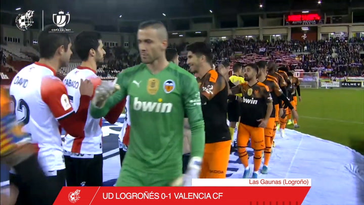 Veinticinco minutos de dominio, un gol y más de una hora de intranquilidad con picos de sufrimiento. Así fue el debut del Valencia contra un crecido Logroñés en la Copa en la que defiende el título y en la que cerró con más oficio que brillo el pase a octavos.