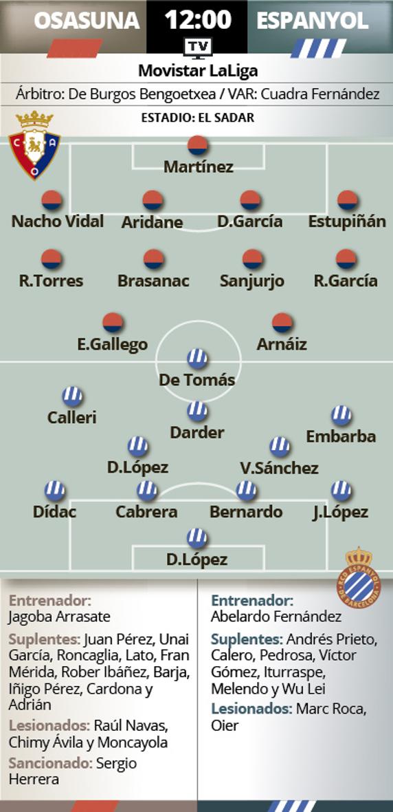 El Espanyol visita hoy El Sadar con un único objetivo en mente pues ya no le vale otro resultado: una victoria. Al colista se le acaba el tiempo. Le urge ganar para seguir creyendo en la permanencia y de paso, rezará para que los directos rivales, que tienen citas complicadas, pinchen. Pero primero los de Abelardo deben hacer los deberes pues todo lo que no sea hoy sumar de tres, es una bofetada en la pelea por salvarse.